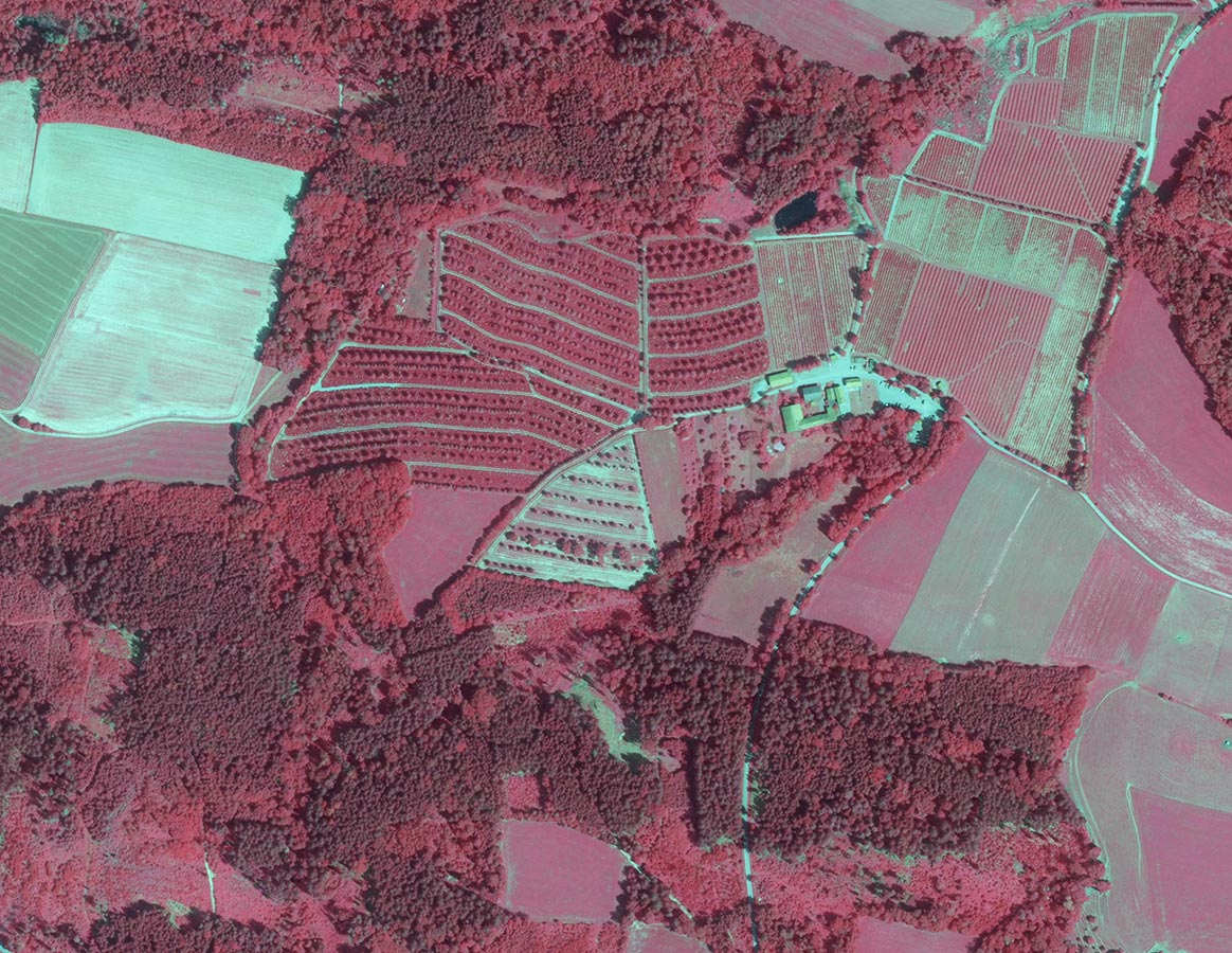 Aus der Luft sind die Christbaumplantagen als kleine Waldstücke besonders schön zu sehen. In Color-Infrarot-Luftbildern heben sich Tannenbäume eindrucksvoll hervor und zeigen die Vielfalt der Bayerischen Weihnachtsbaumkultur.