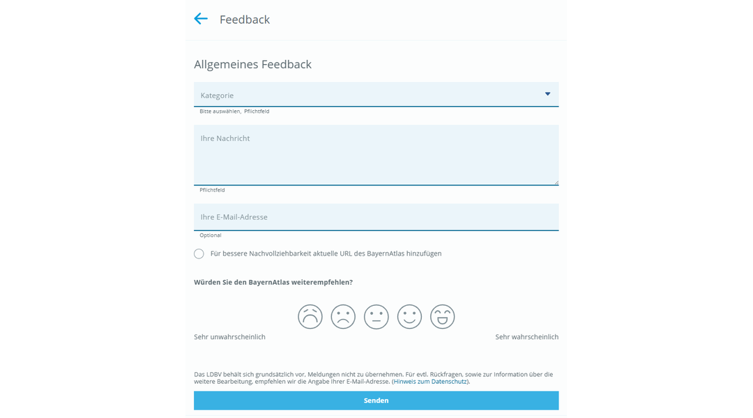 Bevor Sie abschließend auf Senden klicken, würden wir uns über eine Bewertung des BayernAtlas durch die Auswahl eines Smileys freuen.