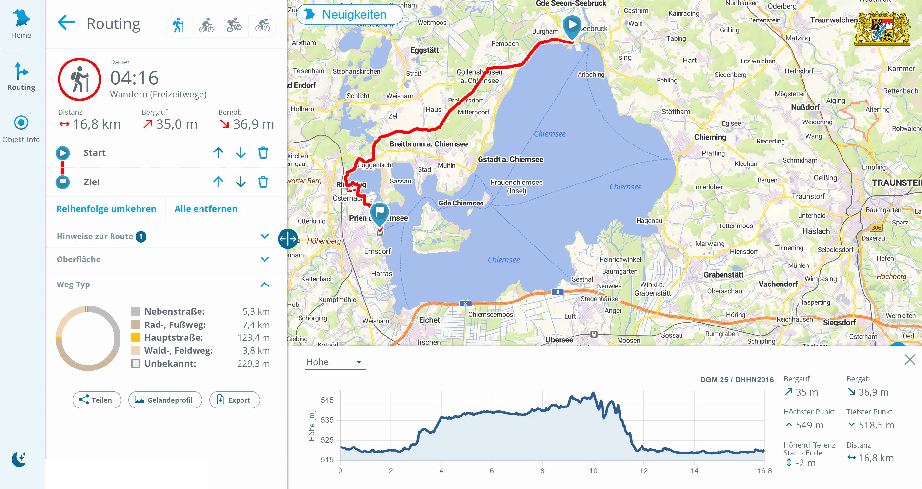 Für die Weg-Typen werden Ihnen die Anteile an z. B. Wald-/Feldwegen, Nebenstraßen usw. in Prozent angegeben.