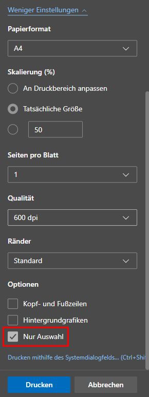 Alternativ kann der markierte Bereich kopiert und in ein Textverarbeitungsprogramm eingefügt werden.