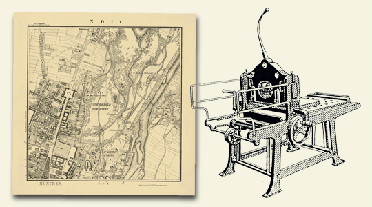 Damals erfolgt die Vervielfältigung der Flurkarten mit dem direkten Flachdruckverfahren von Alois Senefelder (Lithografie, Steindruck).