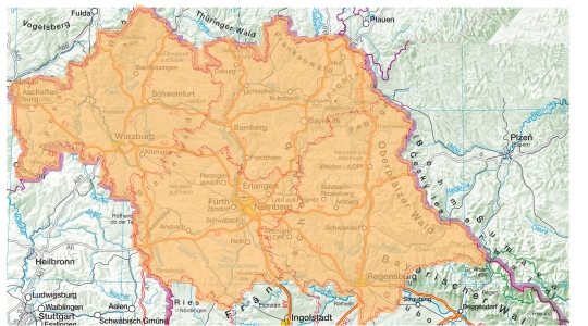 Die Bayernbefliegung 2025 deckt die Regierungsbezirke Oberfranken, Unterfranken, Mittelfranken und Oberpfalz ab. Den aktuellen Stand der Befliegung und die Gebietsaufteilung finden Sie im BayernAtlas.